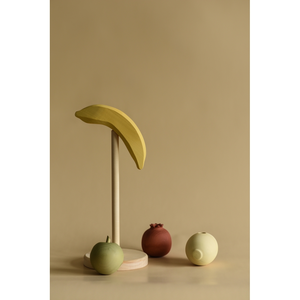 Stivuitorul de fructe este alcatuit dintr-o baza cu un bat rotund pe care sunt asezate fructele. Exista in total patru fructe in culori si dimensiuni diferite care pot fi inchise rapid in jurul batului cu o minge rotunda deasupra.