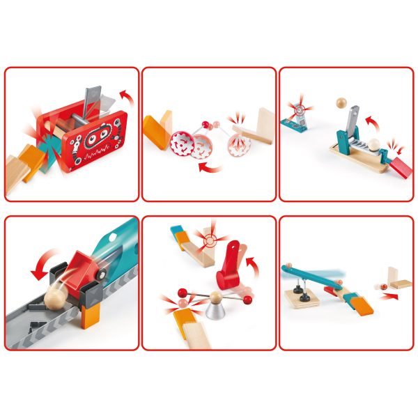 Include cinci conectori, cinci sine cu bile cu doua fete, un balansoar, o roata de impuls, un brat care se roteste, un brat de eliberare gravitationala, o cutie pentru steag de finisare, un tunel, o masina basculanta, trei bile de lemn, o bila, un domino special, o jumatate de domino, doua piese de domino inalte, doua piese de domino medii si 93 de domino standard.