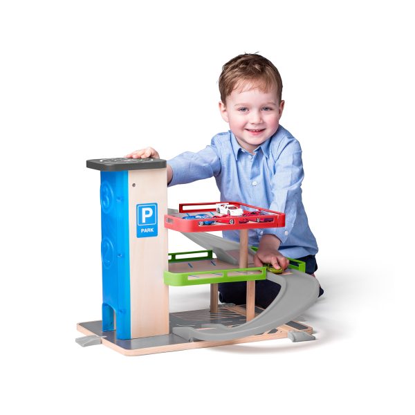 Un garaj din lemn cu un ascensor este foarte distractiv pentru micutii auto. Pur si simplu duceti masina la lift, duceti-o la ultimul etaj si parcati sau coborati la etaj. Garajul are trei niveluri de reglare a liftului. Ascensorul poate fi miscat usor mecanic in sus si in jos datorita rotii pivotante.