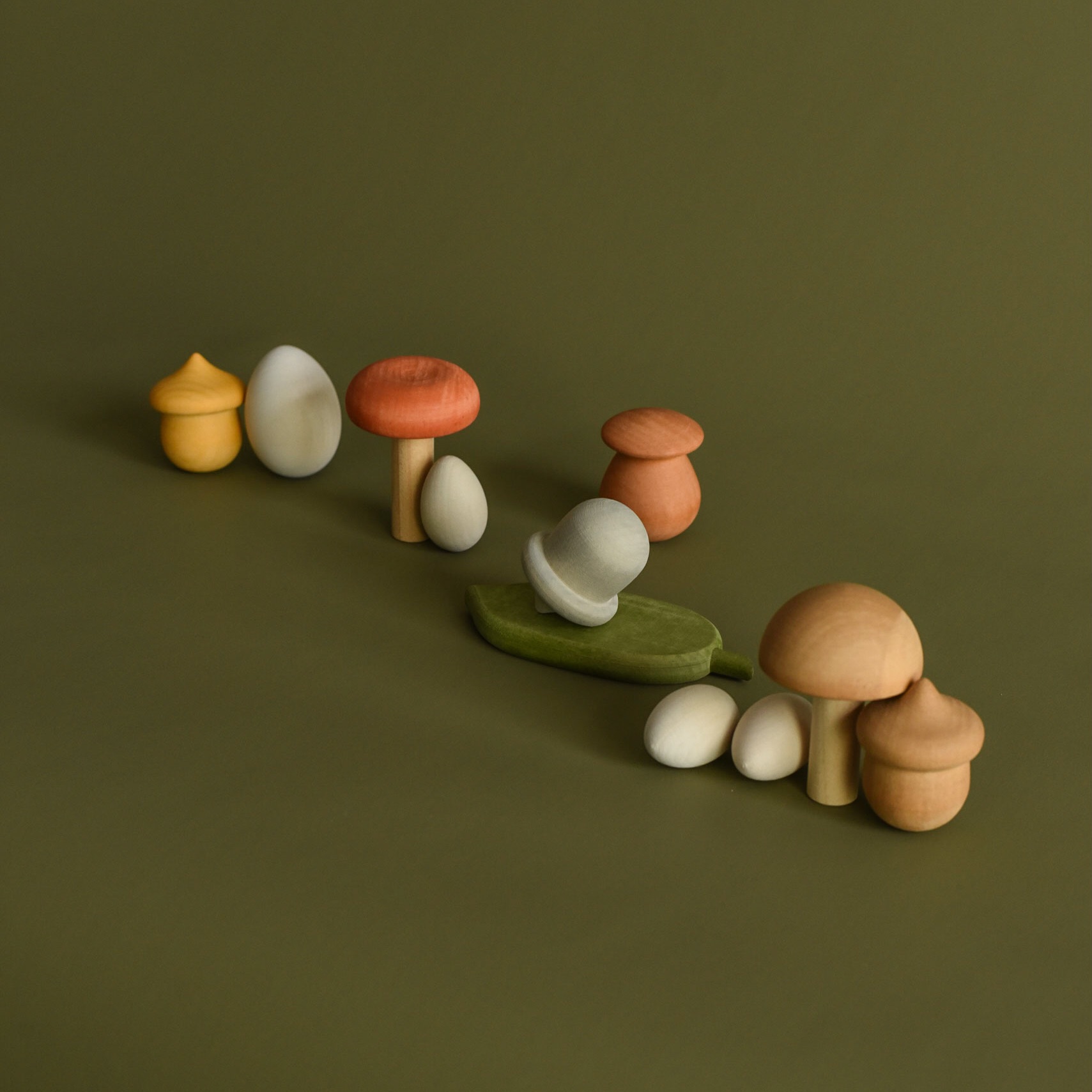 Set frumos si unic din lemn care hraneste imaginatia copilului. Imagineaza-ti ca te afli in padure si cauti comori pe care natura minunata ni le ofera precum ciuperci, oua, ghinde, frunze.