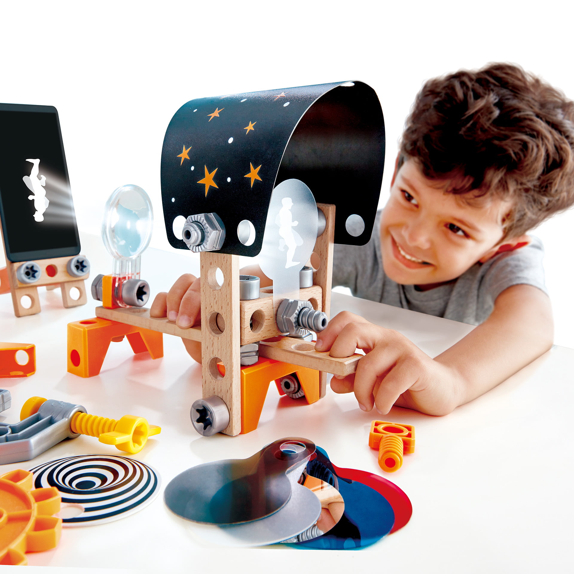 Setul include un periscop, o iluzie de con, un vizualizator 3D, un caleidoscop rotativ, o oglinda infinit, un laborator optic, un pendul de iluzie optica si o camera obscura.