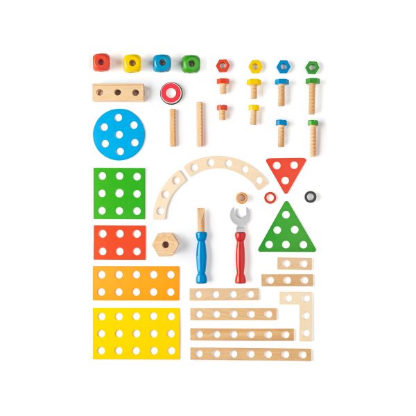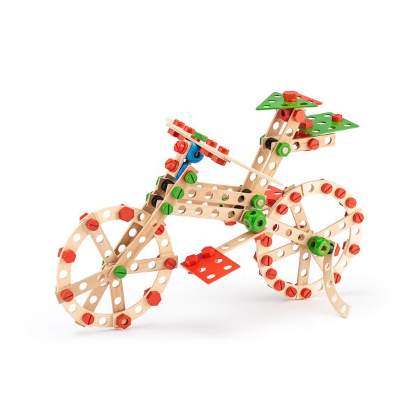 Contine un numar mare de piese din lemn de inalta calitate (placi din lemn de diferite forme, piulite, suruburi, roti, saibe, surubelnita si cheie de asamblare etc…), cu care sunt usor de lucrat si care creeaza o structura solida atunci cand suruburile sunt stranse.