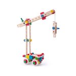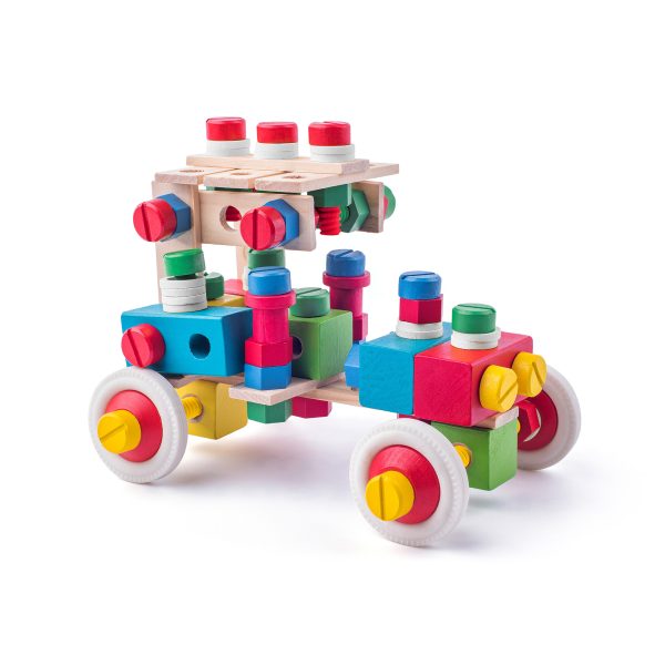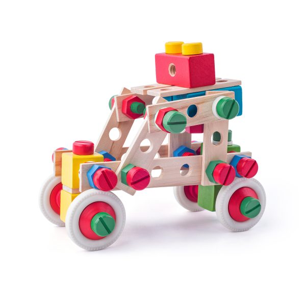 Setul contine piese prelucrate de inalta calitate. Blocurile de montaj si cuplajele sunt din lemn, suruburile si piulitele sunt din plastic solid de inalta calitate, iar rotile sunt din cauciuc solid. Trusa ofera copiilor posibilitatea de a pune impreuna si a asambla diverse modele de masini si alte masini fantastice conform propriei imaginatii. Apoi pot pune totul inapoi intr-o galeata practica de hartie. O surubelnita din lemn este inclusa in pachet.