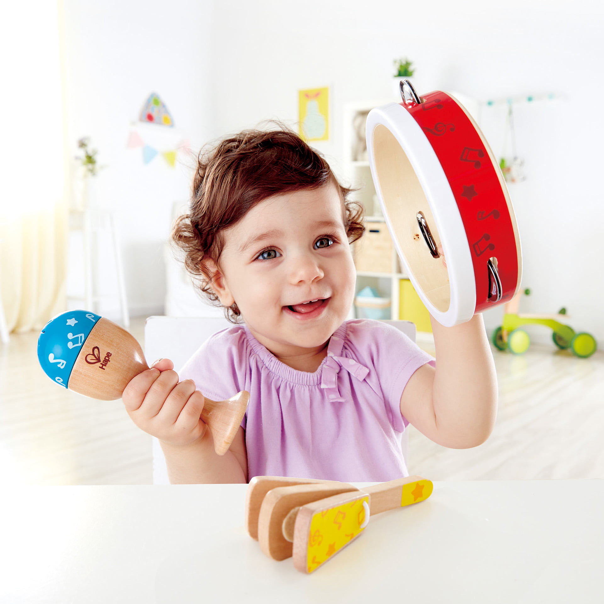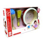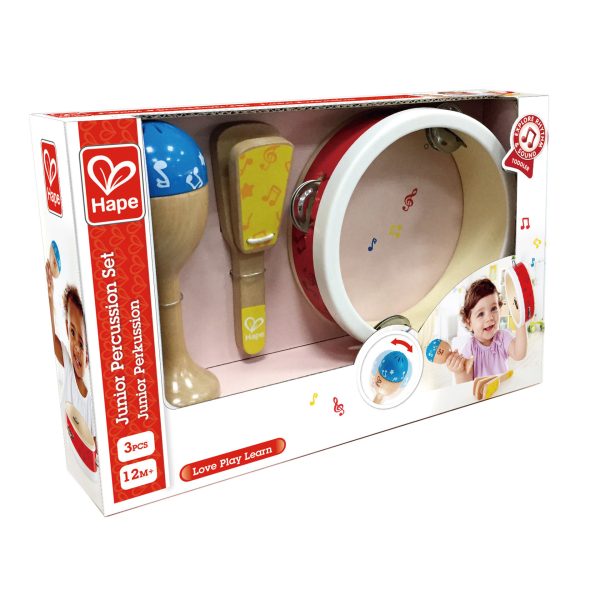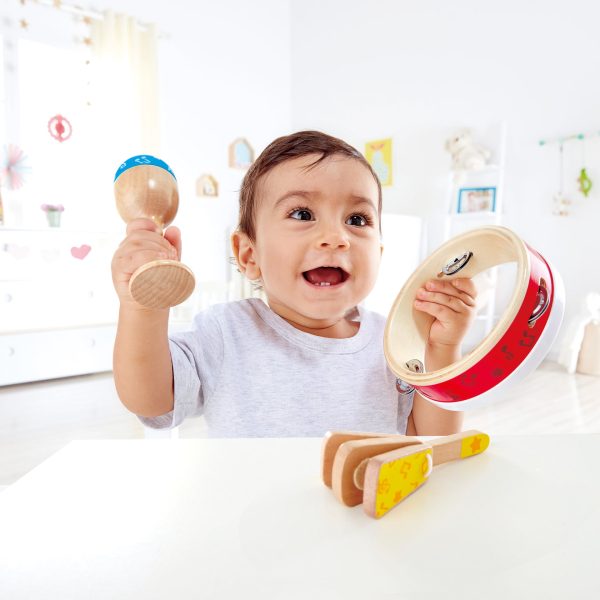Asculta-ti micuta vedeta rock in ritmuri constante ale instrumentului muzical cu acest set de percutie din trei piese din lemn, care include o tamburina, o maraca si o clapa.