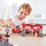 Trecerea la nivel poate fi deschisa si inchisa pentru a preveni accidentele, iar camionul basculant are o basculanta mobila pentru un plus de distractie. Setul include semne de siguranta si un semnal feroviar reglabil.