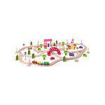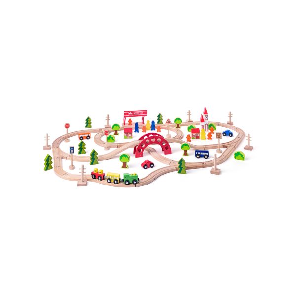 Jucarie din lemn – Set tren cu pod si bariera (90 piese)