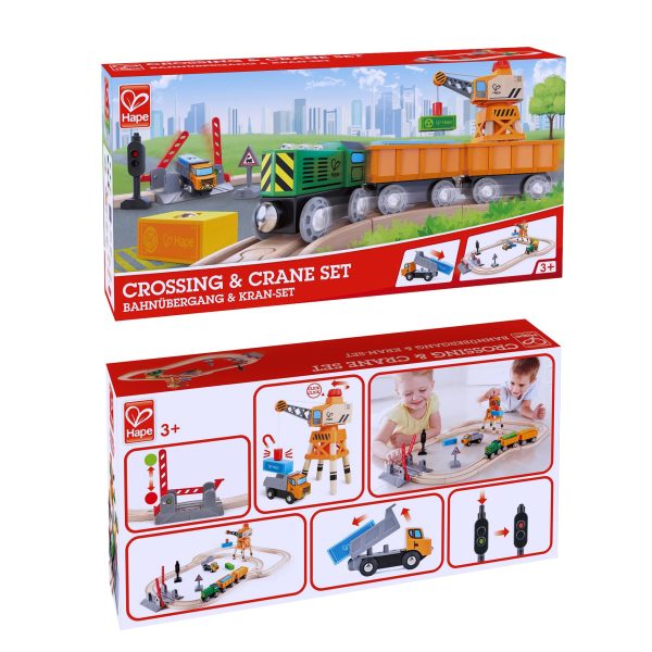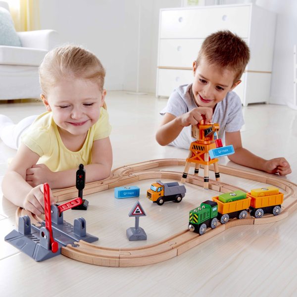 Trecerea la nivel realista a acestui set de jucarii cu tren din lemn poate fi deschisa si inchisa pentru a mentine ordinea in trafic. Setul de jucarii include, de asemenea, un camion basculant care are o basculanta mobila pentru incarcarea sau mutarea incarcaturii.