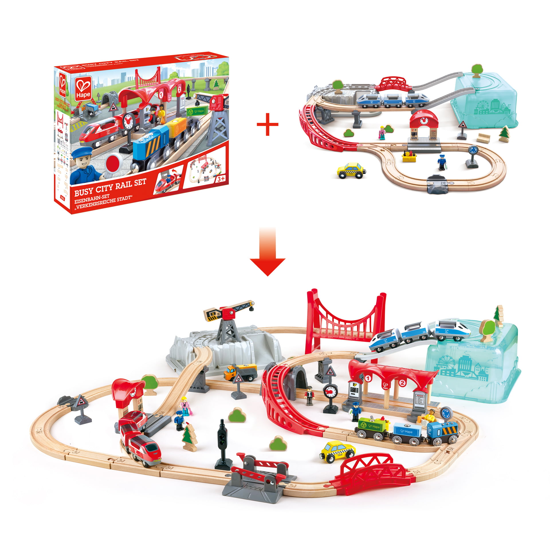 Setul include un pod, cinci cheiuri, o gara, un taxi, un scaun, doua semne de circulatie, un suport pentru scule cu sase unelte, un conductor de tren, un pasager, trei vagoane si multe altele. Compatibil cu alte garnituri de tren Hape.