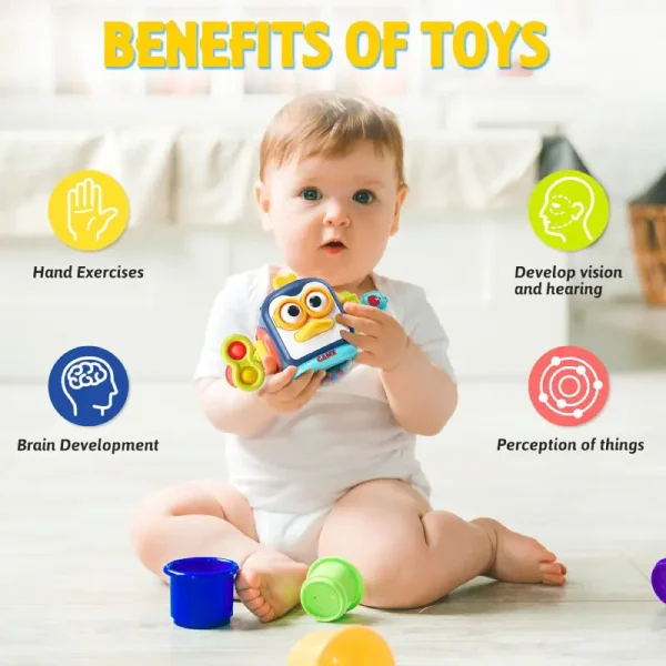 Jucărie Interactiva Senzoriala Busy Cube Bebelusi este jucăria ideală pentru a transforma momentele de joacă ale copilului într-o experiență plină de învățare și distracție.