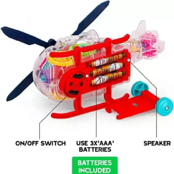 Carcasa elicopterului este transparenta,astfel putandu-se vedea functionarea mecanismelor.