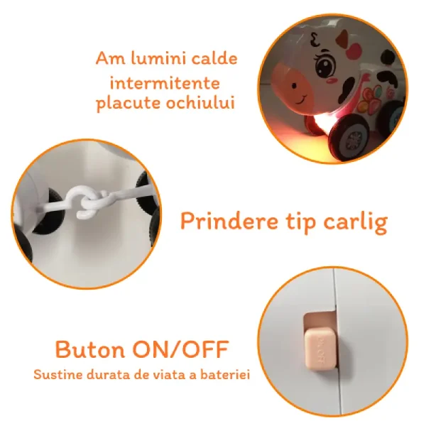 Această jucărie inovatoare combină sunete melodioase, efecte luminoase captivante și designul adorabil al unei vacute mama cu puii săi.