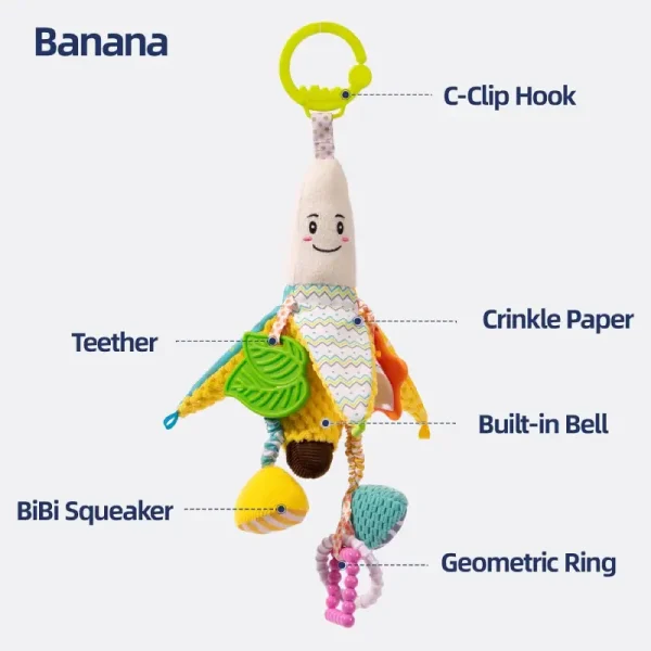 Jucăria banana senzoriala este fabricată din materiale sigure pentru bebeluși, non-toxice și rezistente la rontait.