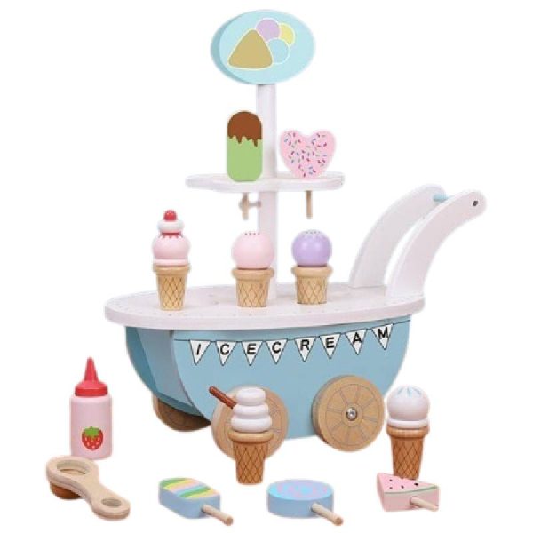 Realizat din lemn de calitate și decorat cu culori pastelate, căruciorul vine cu o varietate de înghețate și accesorii pentru ca cei mici să-și poată imagina propriul stand de înghețată.