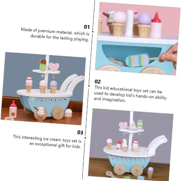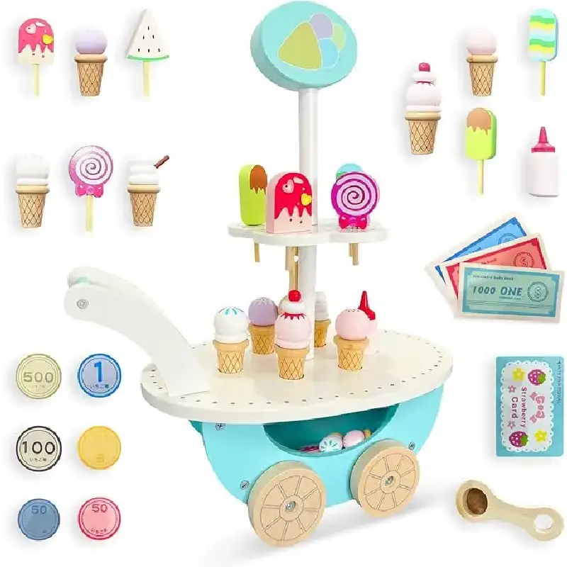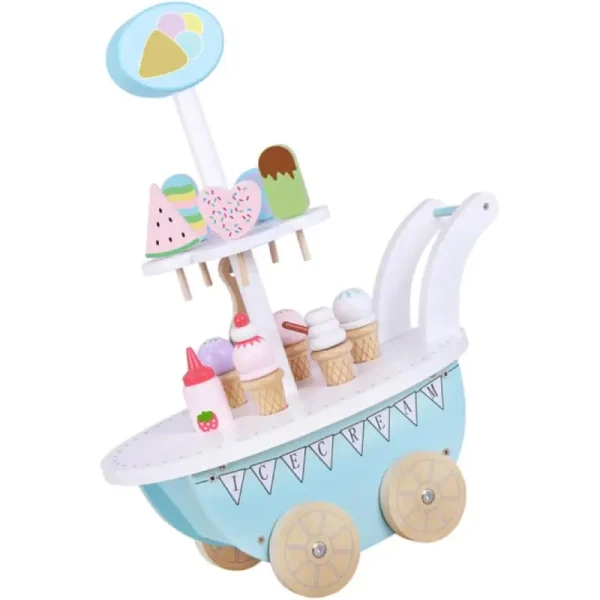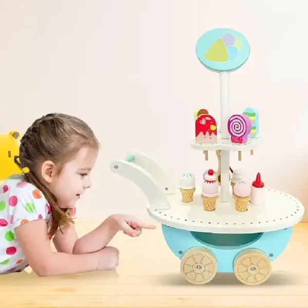 Beneficii Jucarie Lemn Carucior Mobil cu Inghetata si Accesorii: