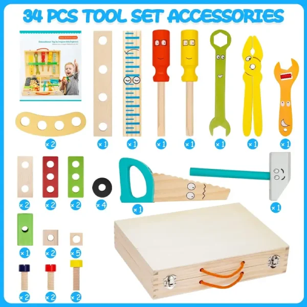Caracteristici Jucarie Lemn Montessori DIY Trusa Scule 34Piese :