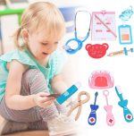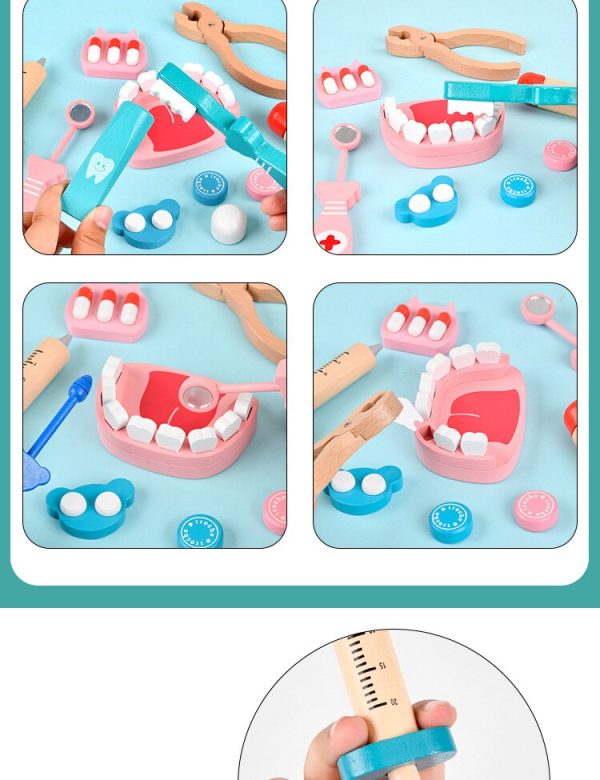 Include diferite accesorii necesare unui micut doctor stomatolog.