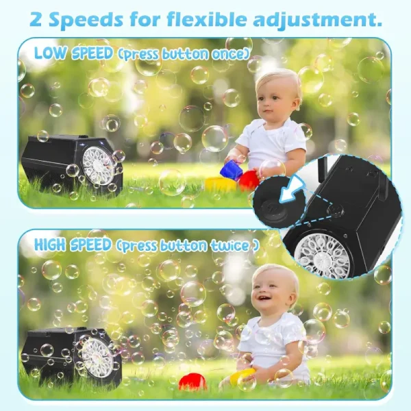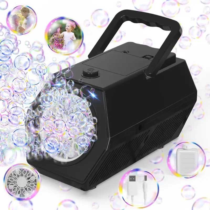 - **Design Elegant și Funcțional**: Cu o carcasă neagra modernă și un design ergonomic, mașina de suflat bule este ușor de utilizat și de transportat, adaptându-se perfect oricărui decor.