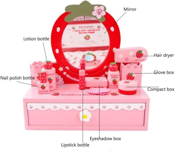 Jucarie Masuta de Toaleta Accesorii Capsunica este tot ceea ce arenevoie o fetita pentru a se aranja intocmai ca o mica printesa.