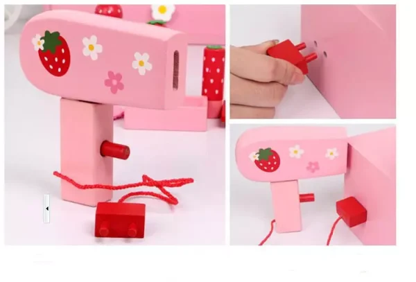 - un foehn care se poate conecta la priza de jucarie din spatele masutei