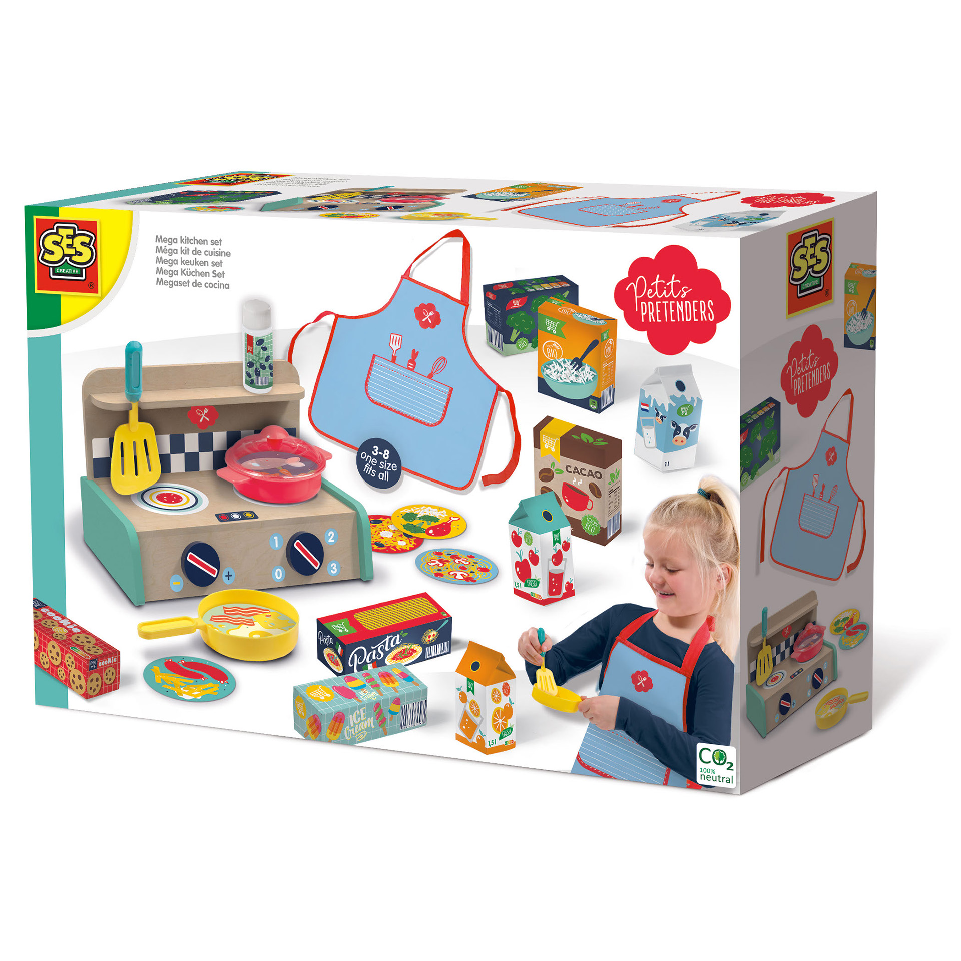 Contine: bucatarie din lemn; sort bucatar; tigaie; tigaie cu capac; spatula; vase tiparite; 10 pachete de produse de supermarket; autocolante; instructiuni.
