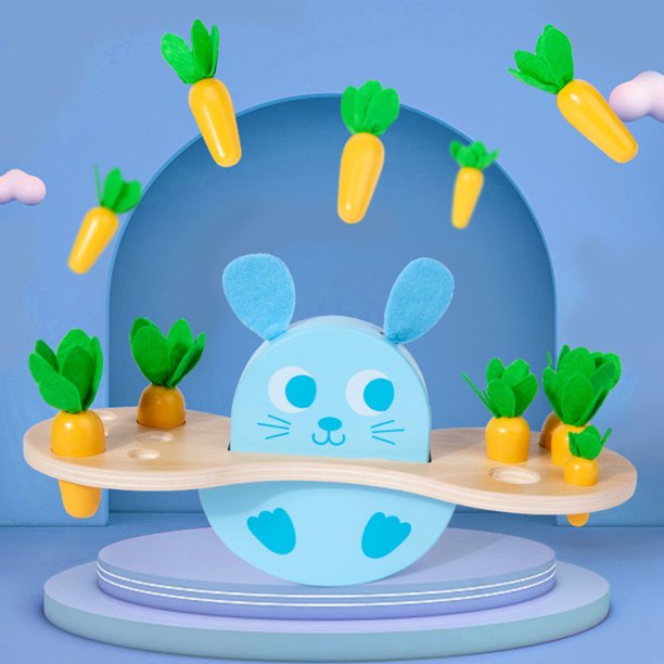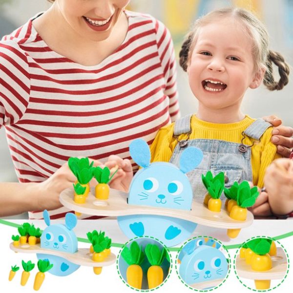 Jucarie Montessori Balanta Lemn Iepuras Morcov ii atrage pe copii si in joaca invata notiuni despre greutate si echilibru.