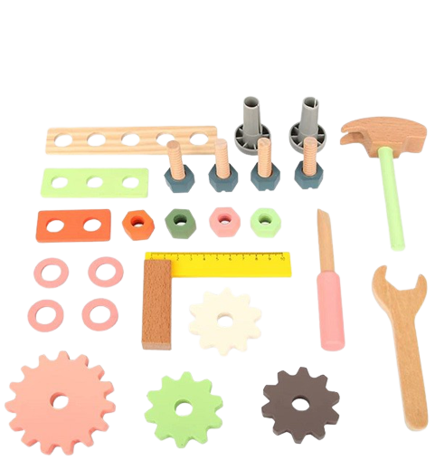 Surubelnita,ciocanul si cheia sunt concepute pentru a se potrivi cu un set de suruburi geometrice in culori diferite,pentru a stimula coordonarea mana-ochi.