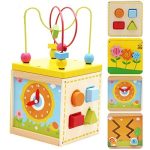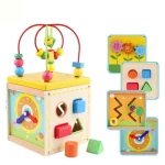 Jucarie Montessori Cub Multifunctional Lemn 5in1 stimuleaza motricitatea fina si dezvolta diferite abilitati copiilor.