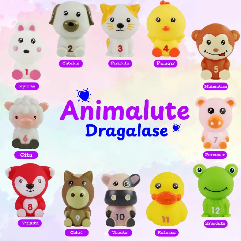 12 animăluțe vesele (leu, iepuraș, broscuță, pisică, câine, rață, porc, maimuță, cal, oaie, vulpe etc.)