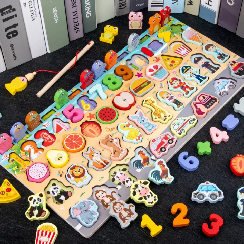 Acest set adună tot ce îi place unui copil într-un singur joc: pescuit magnetic, numere 3D, animale, fructe colorate, vehicule, calcule simple și multe forme distractive. Fiecare piesă este realizată din lemn neted, vopsit cu culori sigure, non-toxice – perfect pentru copiii mici.