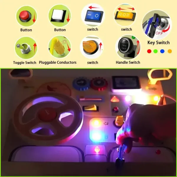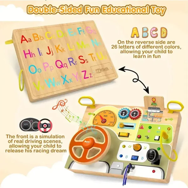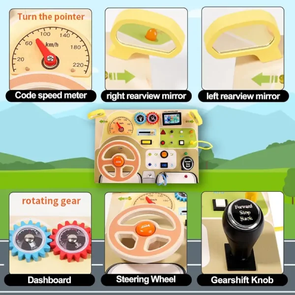 Este o jucărie educativă Montessori sub forma unui bord interactiv de condus, creat special pentru copii mici.