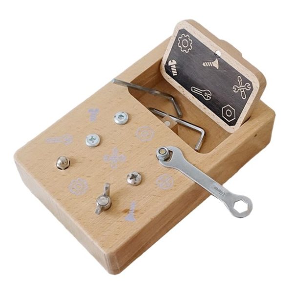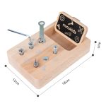 Mini banc de lucru din lemn cu suruburi si mini ustensile, in stil Montessori