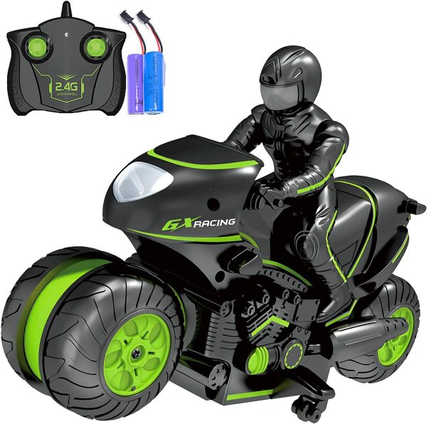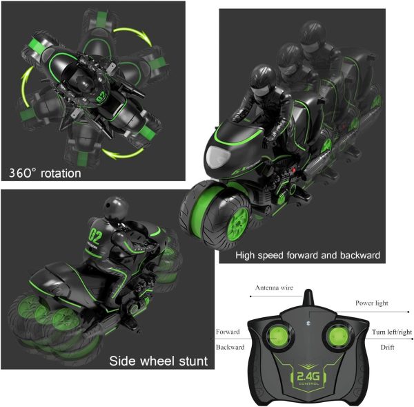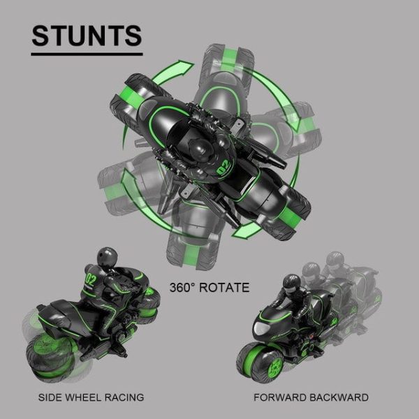 Jucarie Motocicleta cu Telecomanda Rotatie 360 Grade Verde este usor de manevrat prin telecomanda cu radio-frecventa de 2,4GHz.