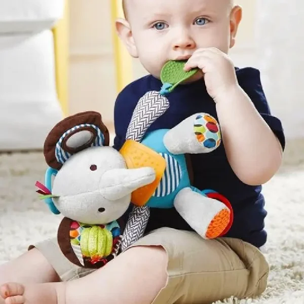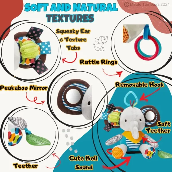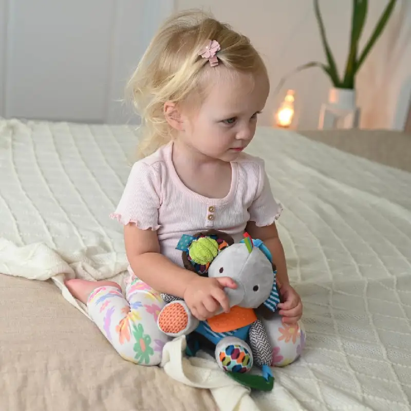Cu urechi zornăitoare, elemente texturate pentru dentiție, oglinjoară pentru auto-descoperire și jucării colorate pentru coordonare, elefănțelul prinde viață în mânuțele curioase ale micuțului tău.