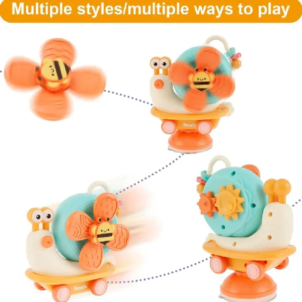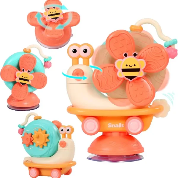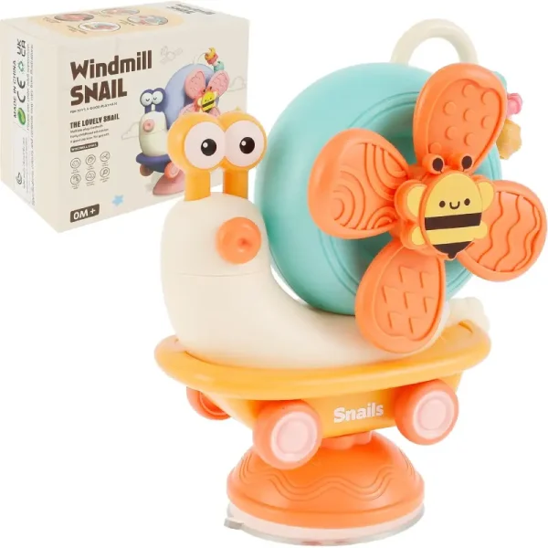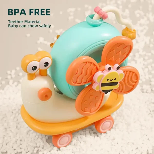 - Design Amuzant și Atractiv: Melcul vesel cu albină și elice rotativă atrage atenția copilului și îl ține ocupat.