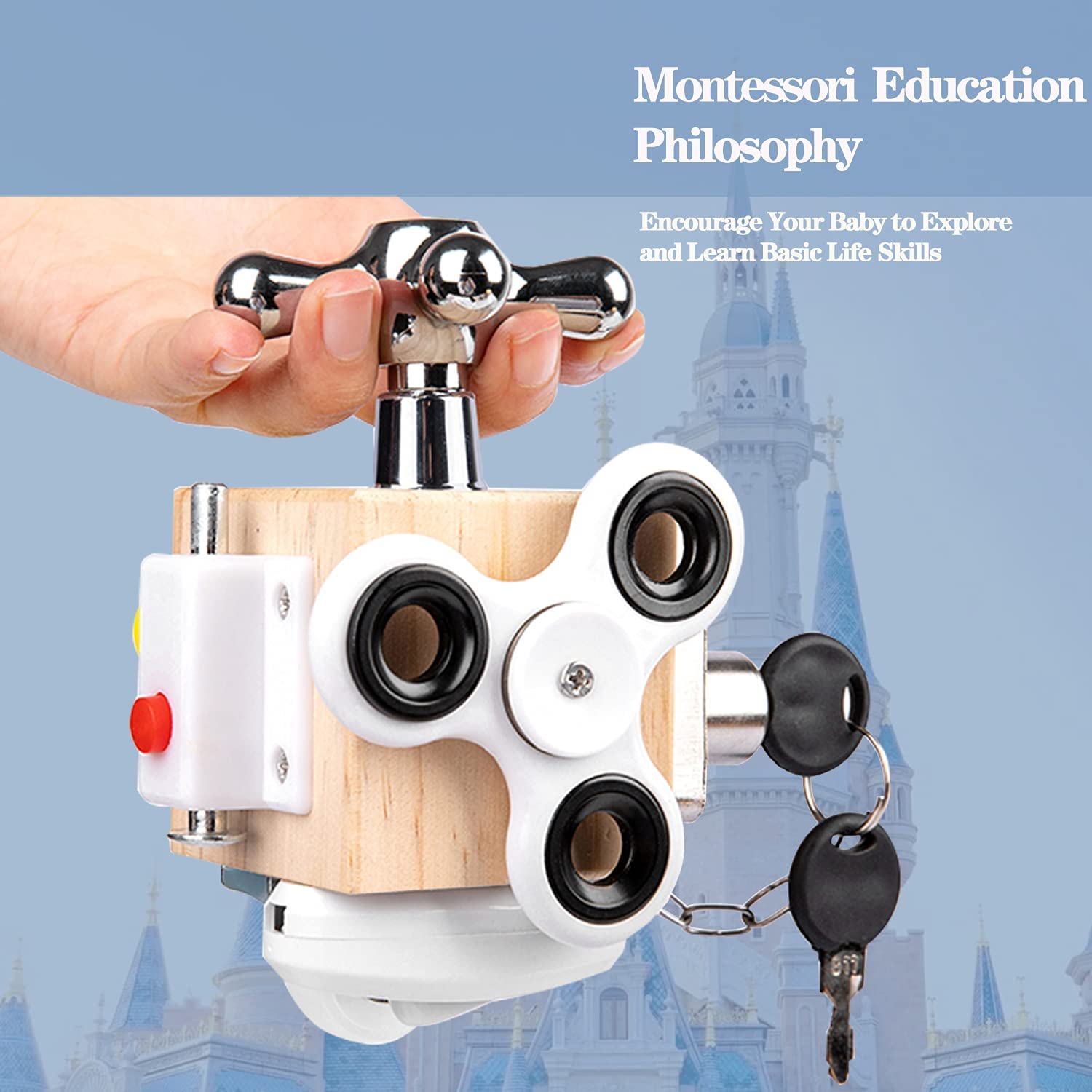 Jucarie Senzoriala Montessori Cub Activitati Busy Board contine :