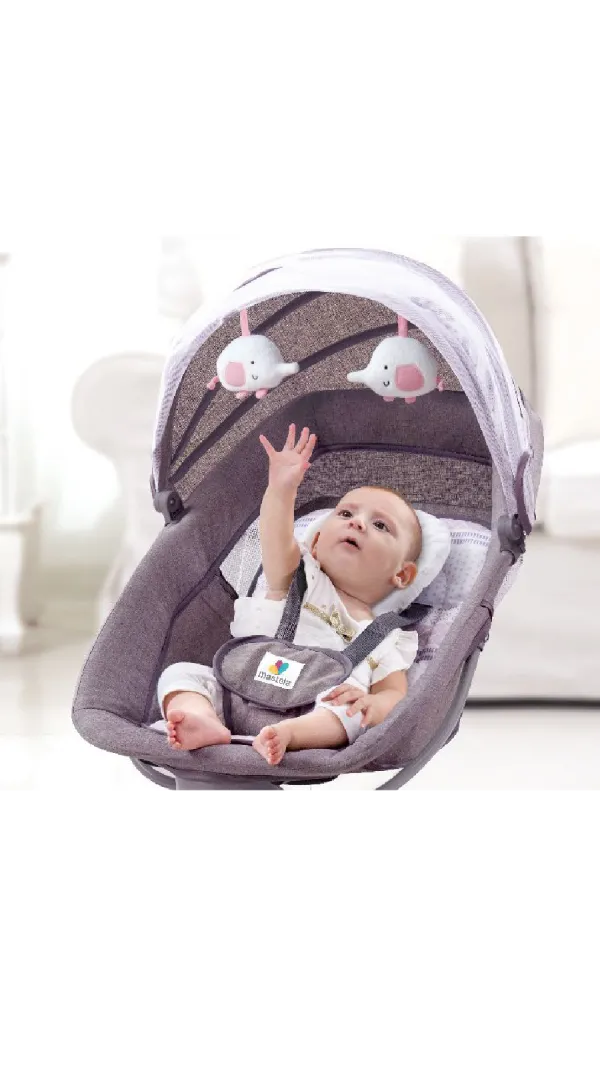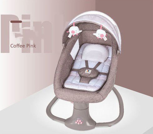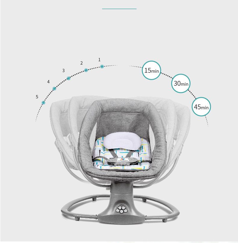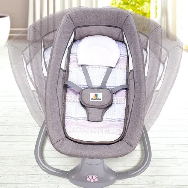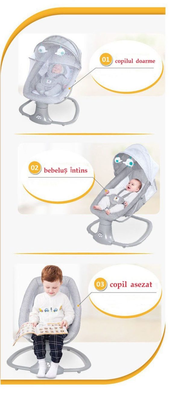 Funcționează electric, are balansare pe mai multe trepte, muzică integrată, jucării suspendate și un design modern care îmbină estetica cu funcționalitatea.