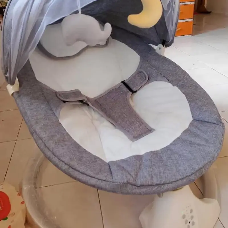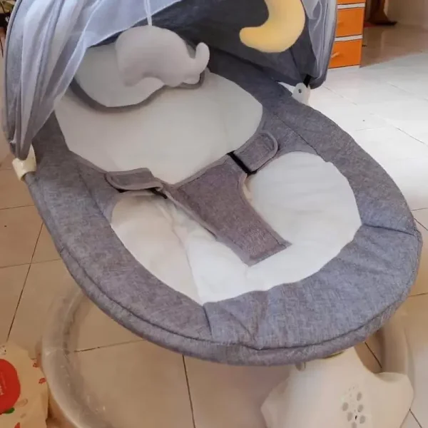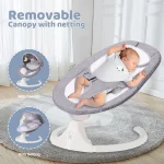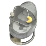Creat special pentru a-i oferi confort, distracție și siguranță, leagănul este dotat cu funcții moderne precum conectivitate Bluetooth, melodii relaxante, mișcare automată de legănare și telecomandă pentru control la distanță.