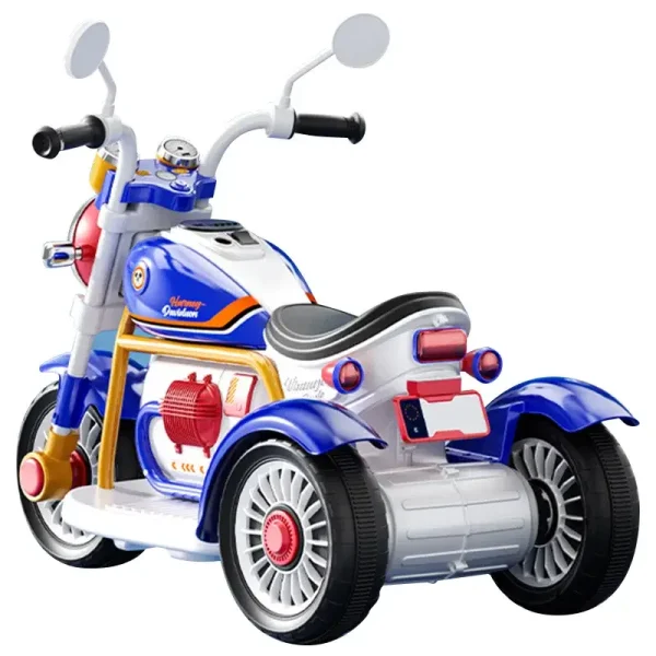 Pregătește-te să cucerești lumea și să transformi fiecare plimbare într-un moment de poveste cu Motocicleta Electrică Vintage pentru fbaieti în nuanțe delicate de bleu si alb!