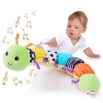 - Sunete și melodii: Omida produce sunete blânde, melodii sau efecte sonore care să atragă atenția și să stimuleze auzul bebelușului.