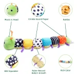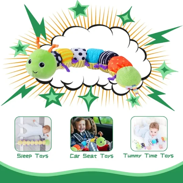 - Texturi variate: Jucăria include texturi variate pe diferite părți ale omidei, permițând bebelușului să exploreze diferite senzații tactile.