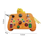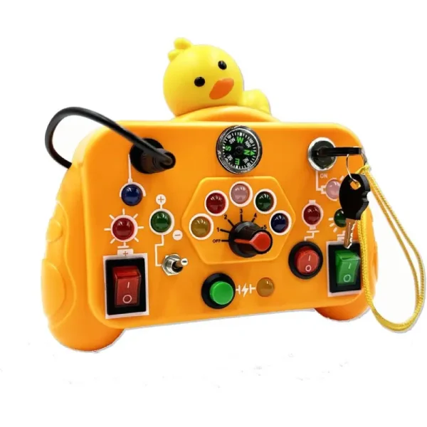 - Explorarea și descoperirea funcțiilor: Copilul poate apăsa, roti, trage și apăsa butoanele de pe panou. Fiecare element are o funcție specifică – de exemplu, butoanele colorate emit sunete sau declanșează luminile, iar comutatoarele pot avea texturi și forme diferite, stimulând simțul tactil.