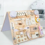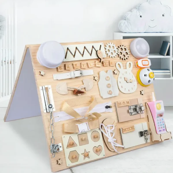 Fabricat din lemn durabil și echipat cu diverse activități interactive, acest panou ajută la dezvoltarea abilităților motorii fine, coordonării mână-ochi și gândirii logice.