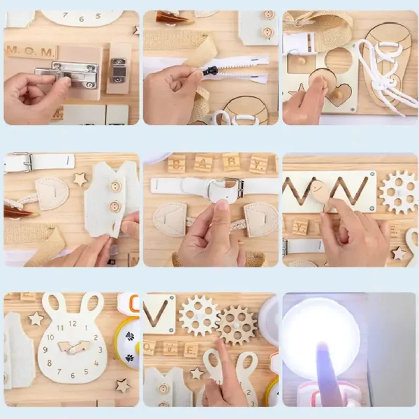 Panoul este realizat din lemn și conține o varietate de elemente interactive, precum încuietori, curele, roți dințate, forme geometrice și alte obiecte pe care copiii le pot deschide, închide, răsuci sau explora.