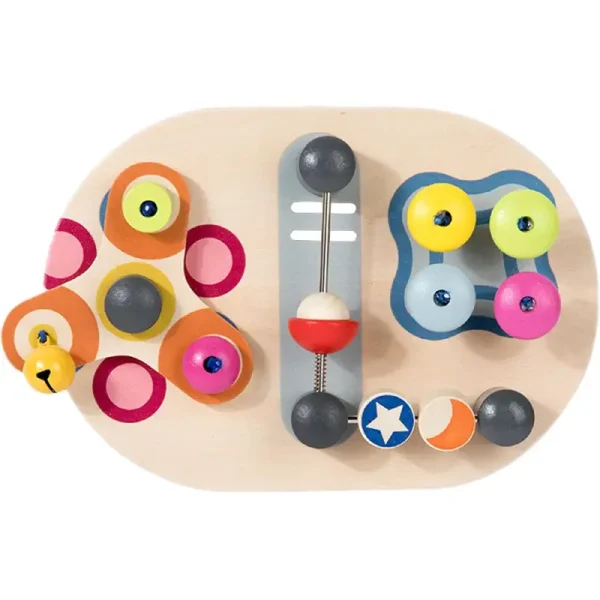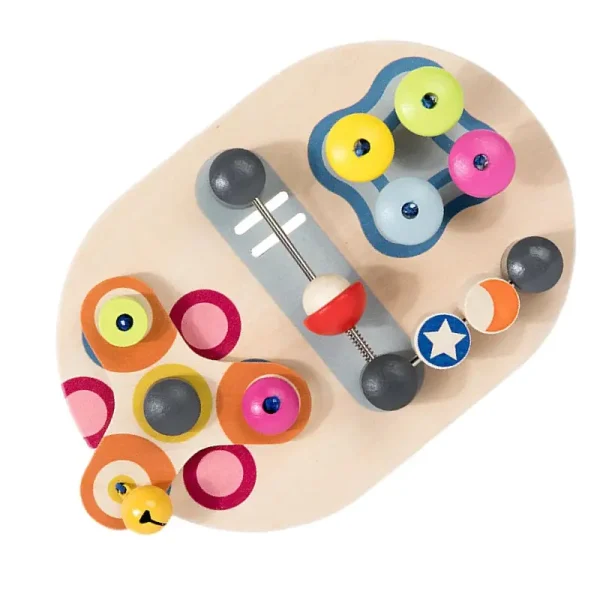 Ajută-l pe micuțul tău să își dezvolte abilitățile motorii și simțurile cu acest panou senzorial din lemn, creat special pentru a încuraja explorarea și învățarea prin joacă.