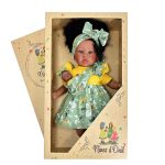 Papusa Maria Afro in rochie colorata din bumbac si bandana este cu adevarat draguta. Ea are si un bebelus cu ochi realisti.