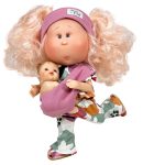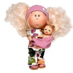 Papusa Nines D’Onil, Mia, cu parul blond, cu bebe, cu articulatii, cu miros de vanilie, 30 cm