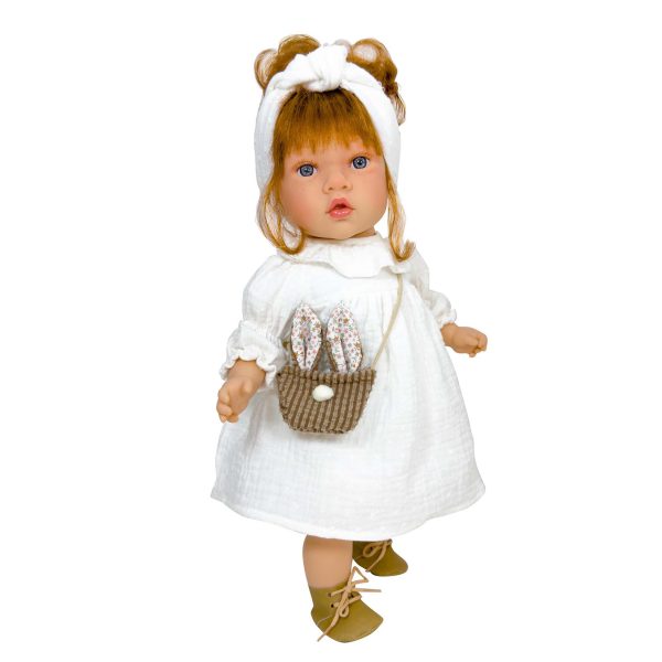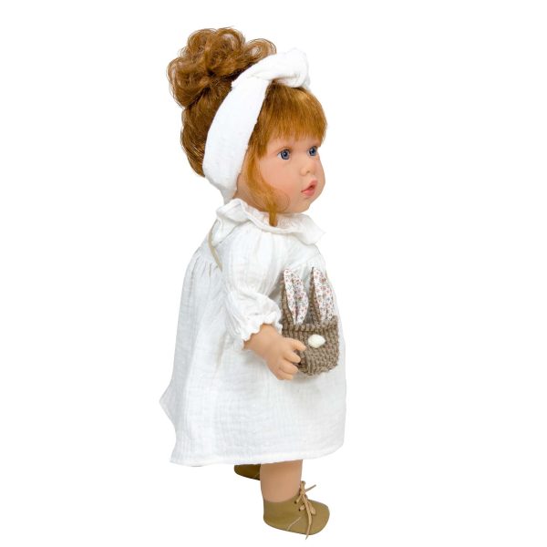 Papusa Nines D’Onil, Susette Plumeti, cu parul roscat, cu sunete, cu rochie alba, cu miros de vanilie, 45 cm