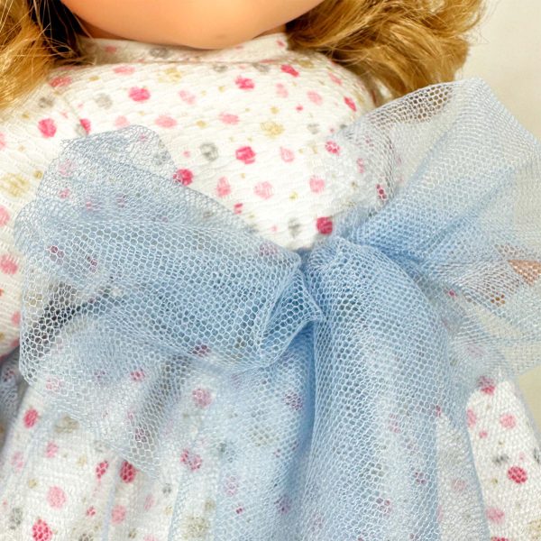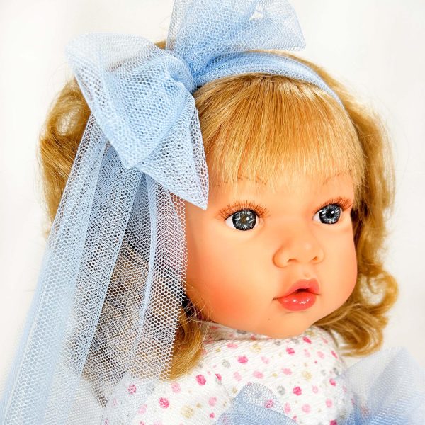 Papusa Nines D’Onil, Susette Tul, cu parul blond, cu sunete, cu funda albastra, cu miros de vanilie, 45 cm