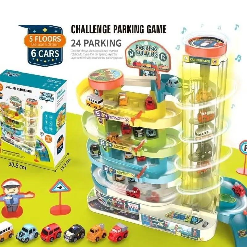Vorbim de o parcare mare, solidă, cu 4 etaje, lift auto transparent, rampe rapide, piste colorate și 6 mașinuțe incluse.