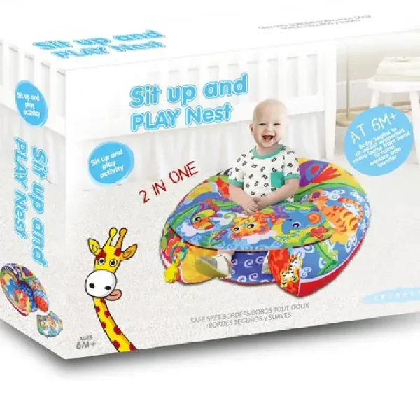 - Suport 2 în 1: Poate fi folosit ca un cuib pentru a sprijini copilul în poziția șezut, dar și ca un spațiu sigur de joacă plin de jucării interactive.